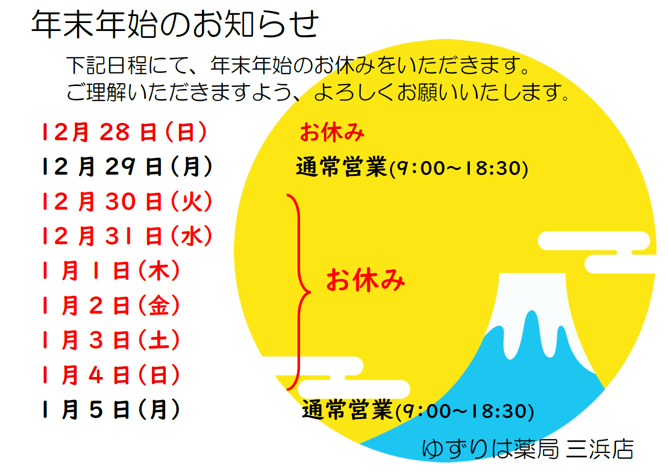 2025/12/24掲載 三浜店 営業のお知らせ 【三浜店】年末年始のお知らせ 三浜店おかもとです。 年末が近づき、何かと慌ただしい時期となりましたが、 皆さまいかがお過ごしでしょうか。 寒さが厳しくなり、体調を崩しやすい時期ですので、 どうぞお体に気をつけてお過ごしください。 誠に勝手ながら、下記の期間を 年末年始の休業期間とさせていただきます。 なお、1月5日(月)より通常通り営業いたします。 休業期間中はご不便をおかけいたしますが、 何卒ご理解のほどよろしくお願いいたします。 CATEGORY News おすすめ商品 日記 営業のお知らせ 採用情報 重要なお知らせ イベント 記事一覧